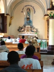 In the early afternoon we sat on the terrace, from which we have a beautiful view of the Caribbean Sea, to study our Creole. Two otherr challenges of today was no water or electricity. During this time we wrote (the old fashioned way with pen and paper) the prayers for the rosary in Creole. Later we walked the streets continuing our novena to St. Francis to meet and greet the people in Jeremie. At 5:15 p.m. we went to the Cathedral to pray the rosary with the Legion of Mary. They seem to gather for the month of October to pray the rosary and a variety of other prayers. We are learning to say the rosary in Creole. At the end of the service everyone received a scripture qoute and we were assured through the passages we received that God had not forgotten us and desires us to walk in faith. They are: John 11:40 and Psalm 72:12, “Didn’t I tell you that you would see God’s glory if you believe?” and “he will rescue the poor when they cry to him; he will help the oppressed who have no one to defend them.”