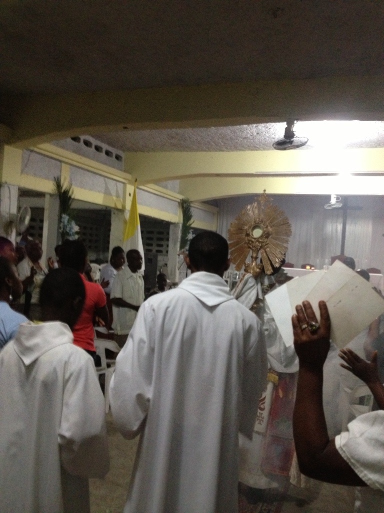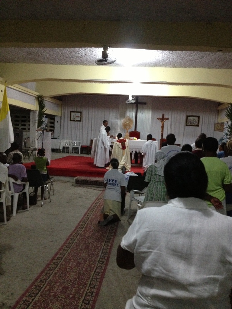 Last night we went to the building that is now the worship space of the Cathedral of Sts. James and Philip. The cathedral of Jacmel was severely damaged in the earthquake and cannot be used. We participated in 2 1/2 hours of charismatic prayer and Eucharistic adoration. We were moved by the faith of the people and the solemnity of the Eucharistic procession. Slowly but surely we are beginning to understand more of what is being prayed and preached.