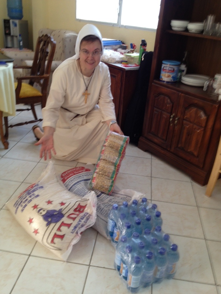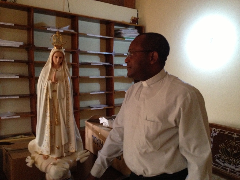 Last September, Maria de Lurdes Castanheira met our Sister Mary Timothy Ruszala (NJ) in the bank and asked her how to get a statue of Our Lady of Fatima to Haiti. Sister Timothy was surprised and said: “It just so happens that we have two sisters beginning a mission there.” That is when Maria told her about the organization to which she belongs, promoting devotion to Our Lady of Fatima. It is their hope that a statue of Our Lady of Fatima will be sent to every country in the world. In December, when we were preparing the container to be sent to Haiti, Our Lady of Fatima was ready to go. She traveled in the container and made it to Jacmel. Last night we presented the statue to Bishop Launay Saturne who was delighted to receive this beautiful image of Our Lady of Fatima from Portugal.