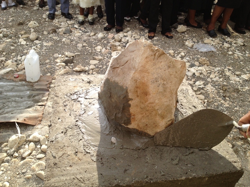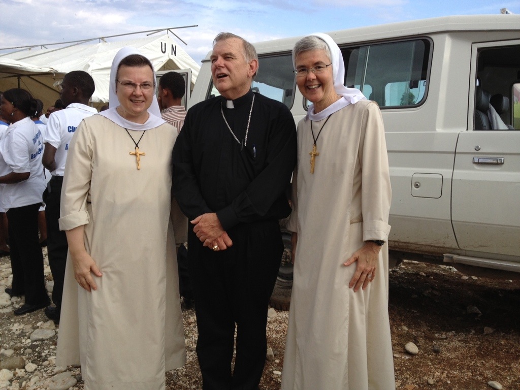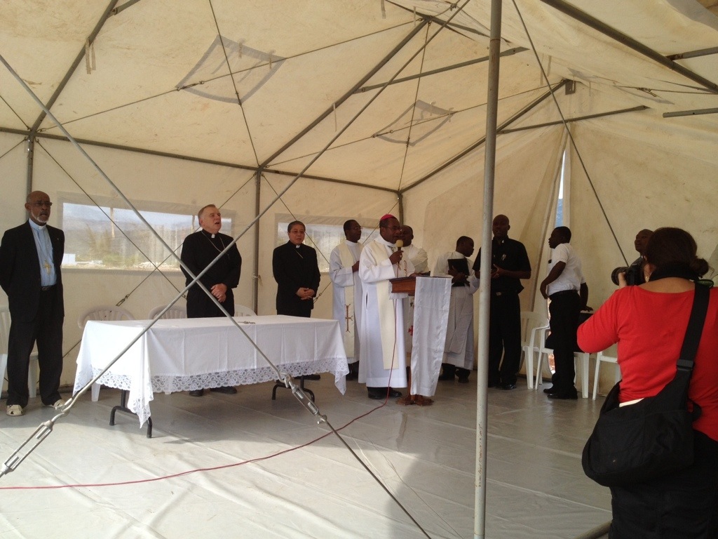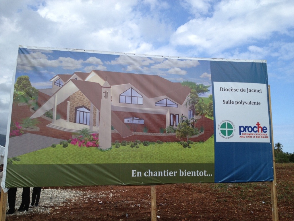 Today, April 30, the Diocese of Jacmel celebrates with great joy as they blessed and broke ground for the new Cathedral. The USCCB (United States Catholic Conference of Bishops) is providing the funds to assist in this building project. Archbishop Thomas Wenski, Archbishop of the Archdiocese of Miami; his Chancellor, Sr. Elizabeth Ann Worley, SSJ; and representatives from the USCCB were present. Archbishop Bernadito Auza, Papal Nuncio for Haiti, and Bishop Joseph Lafontant were also present. The building project is hoped to be completed in eight months. Today we realized that the new cathedral will be right around the corner from where our new convent will be built. As we walked home, a police car stopped and offered us a ride. This was a first for us–to be in a police car in Haiti.