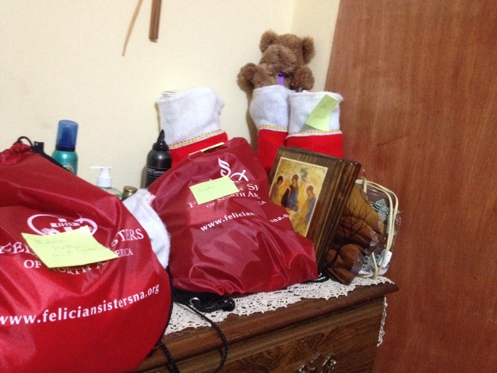 On Christmas Day our chapel was transformed into Bethlehem. It was filled throughout the day with children and young people who came to adore the newborn King, Christ the Lord. With each group, we shared the story of Christ’s birth and His coming among us. During the singing of “Angels We Have Heard on High,” each person came forward to adore Jesus. Some of our children were very poorly dressed, and we thought about the Shepherds who came from the fields to worship Jesus. Everyone received a gift from Jesus. For the children that we have been working with this past year, we had special gifts prepared. The children we had never seen before were given bags of candy and little stuffed animals. It was truly as if God had provided the gifts for his little ones. We had enough for everyone. After we shared a delicious meal prepared by the ladies in the community. We added our own baked goods, too.