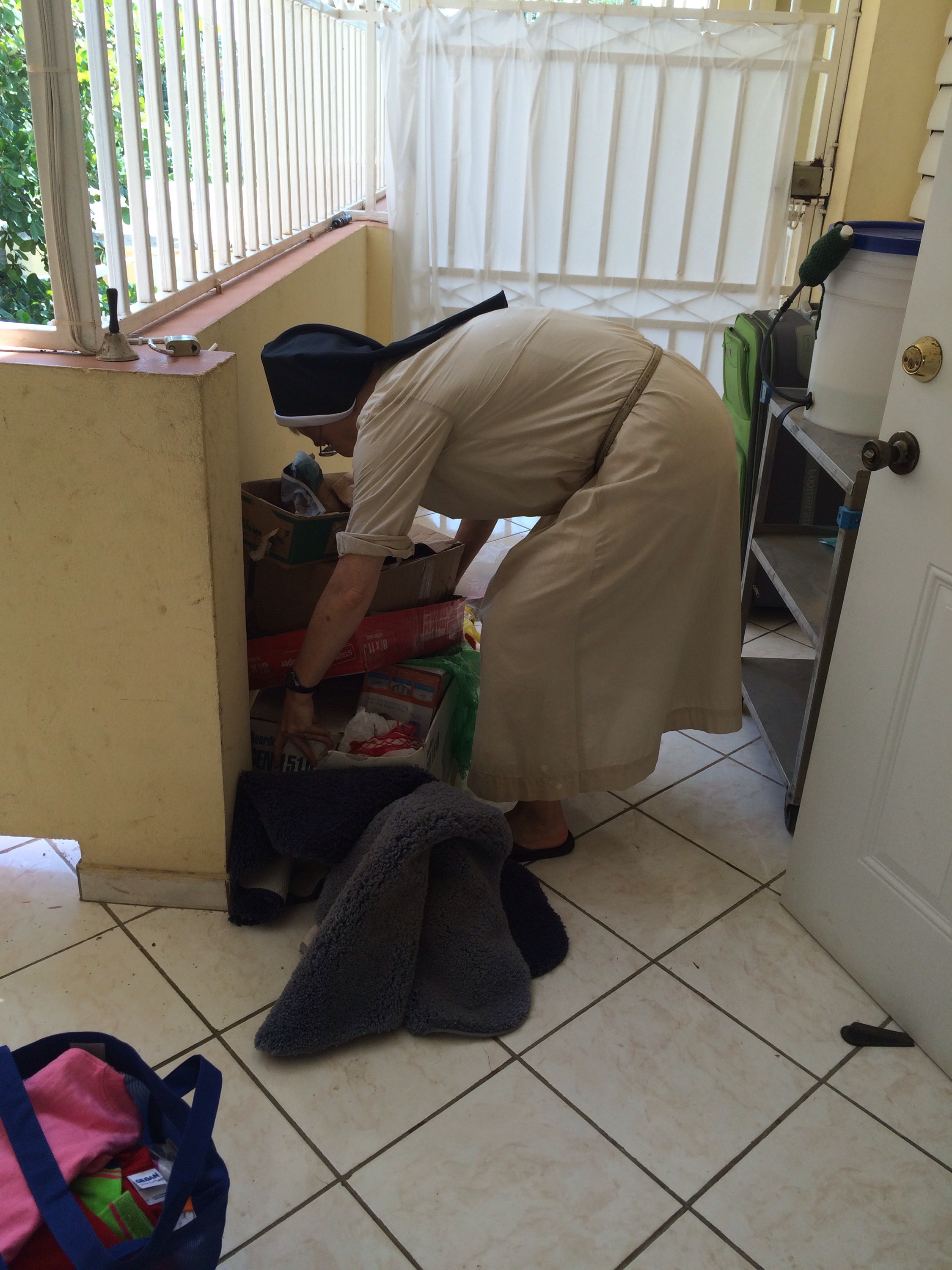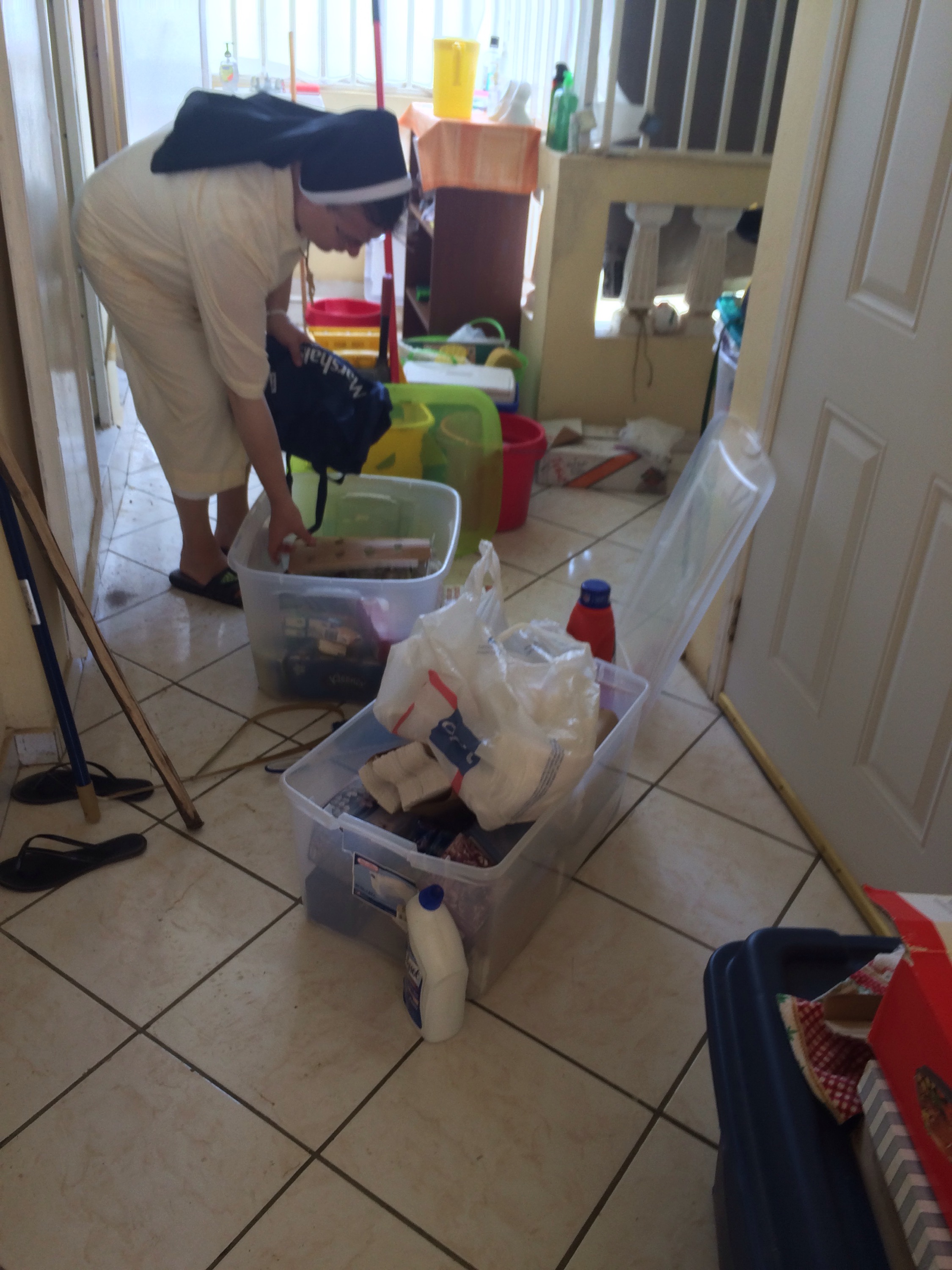 On Saturday, May 2, it was time to clean our household. After unpacking our suitcases, we always put them back into our storage space that was once used by the school for bathrooms. We thought the toilets were all turned off because they have not been used these past two and a half years. But…we learned that there was another pipe, and this pipe had cracked and burst; water was everywhere! It was coming out at a strong force, like a geyser, with jets of water pouring out and flooding everywhere. Sr. Marilyn put her thumb and hand on the broken pipe to stop the flow of water as best she could, and Sr. Inga ran around to every water pipe in the house to shut them off. We did not know from where it was coming. In such a panic, Sr. Inga then called our plumber, Genio, who immediately came over and shut off the main connection for all the water on the compund. Sr. Marilyn was soaking wet, water flooded everywhere, and everything in the closets was wet. We were able to salvage some things in the boxes. It turned out to be a full day of cleaning our closets and rooms where the water had seeped into everything. What a day! Thanks be to God we had some help from our friends!