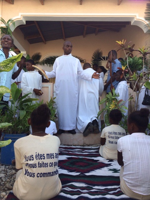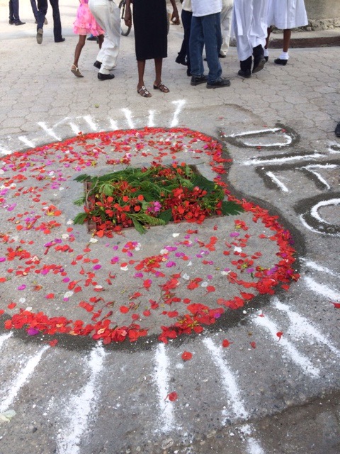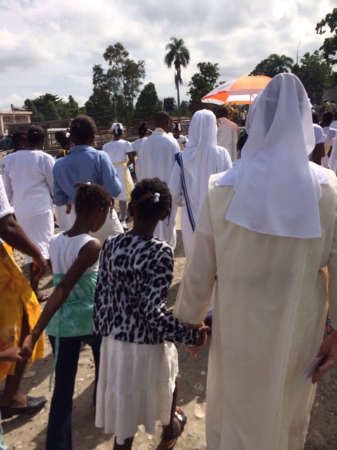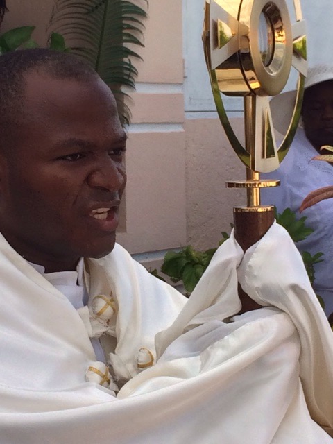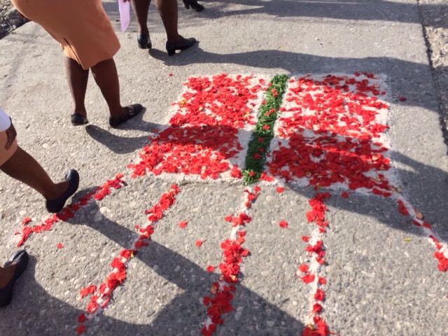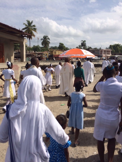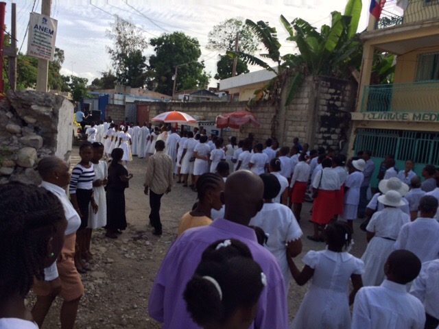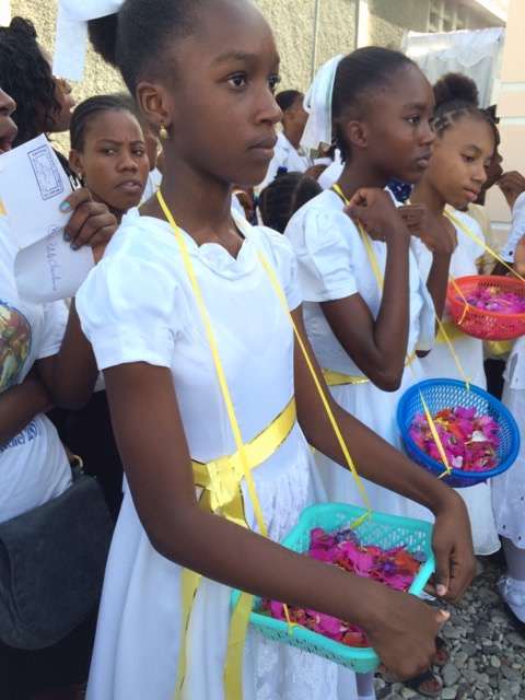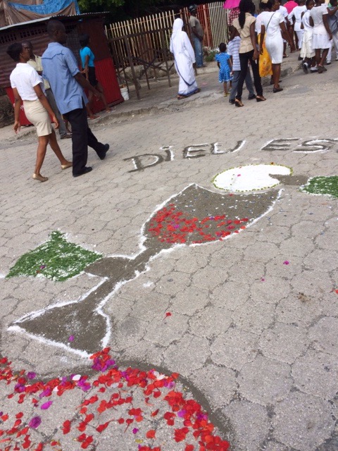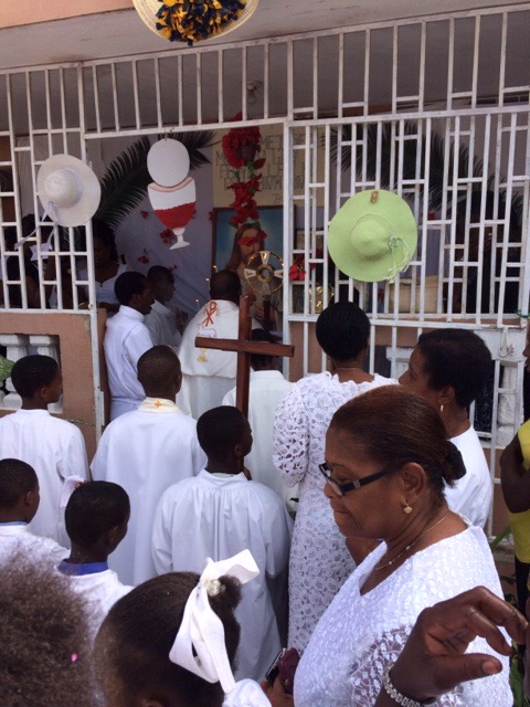 On Thursday, June 4, Haiti celebrated the Feast of the Body and Blood of Christ. It was also the day our kids, who are preparing for their First Confession and First Holy Communion, had their retreat day. We all went to Mass together at St. Michael’s at 6:30 a.m. The Word of God reminded us of how much we are loved by God through His Son Jesus Christ, who sacrificed His life by shedding His blood for us. Everytime we gather in His name to bless, break and share this bread and cup, we, too, are filled with Christ and are to take Him inpto the world. At the end of Mass, all of us prepared for the procession through the streets.