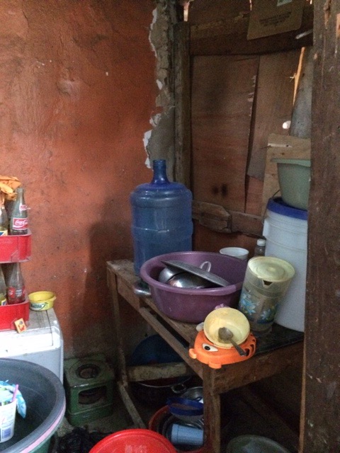 It is a one-room house with two beds and a few chairs. There is another small room for the kitchen. They have an outside space to bathe, but there is no water. They also have electricity when the city provides it for a few hours.