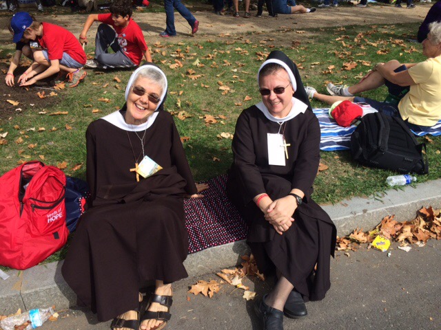 After we finished roaming, we sat down in the section where Sr. Inga was to be; and we prayed our Evening Prayer. As soon as we finished, a gentleman in a suit and a Liberty Bell pin sat down next to us. He asked us where we were from and, of course, we said Jacmel, Haiti. He then said I have something special for you. I have two tickets for you in the second row in front of the Pope!!! We were in awe and unbelief! We asked his name; it was John. He was one of the head committee members of The World Meeting of Families. This happened right before everything started.
