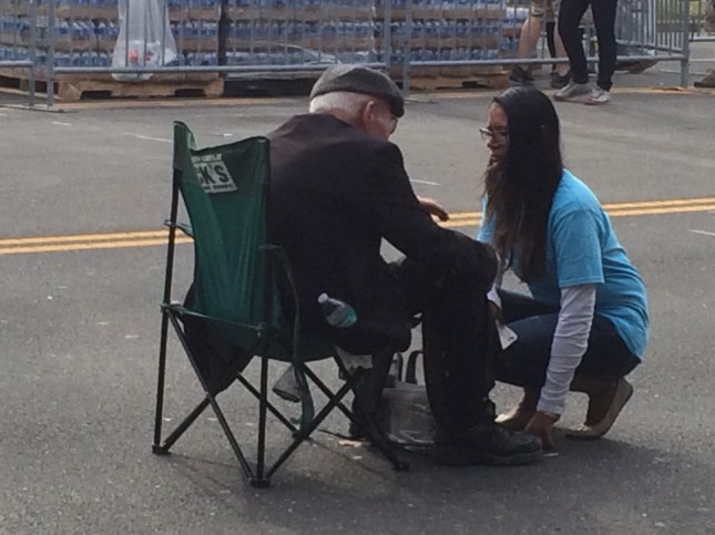 We were sitting on the curb, watching the big screen nearest us. Then we met our Sister Eliana. She shared with us that a young priest in her group was on the other side listening to confessions. We thought this was a great idea. We had just met a priest from Columbia and one from Kansas so we got on a mission of mercy. We asked them if they would listen to confessions on the street. We looked for chairs for them, asking people if we could borrow their chairs. Then the lines formed. It was unbelievable!