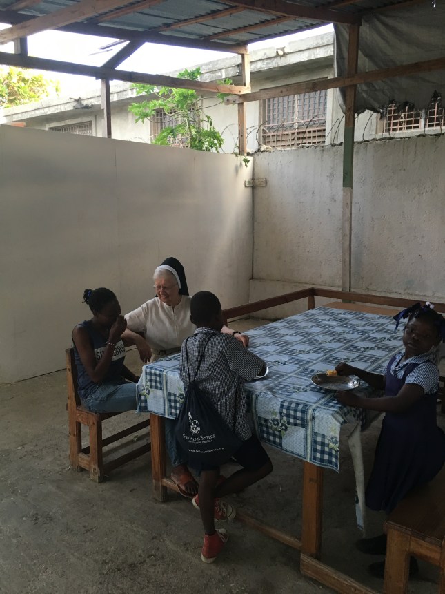 Presence is very much a part of our mission here in Jacmel. We all have the gift and the need to share it with one another. Sisters Adrianna and Nancy are doing that in various ways as they share conversation with our teens, treat wounds or babysit while one of our mothers is working in the Mother Angela kitchen to feed our children.