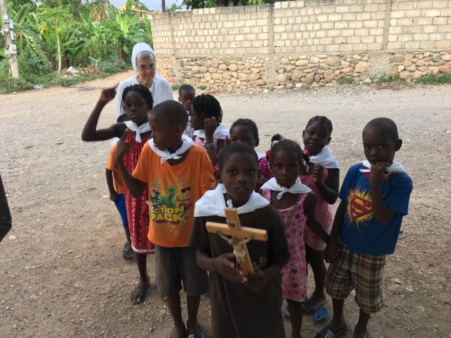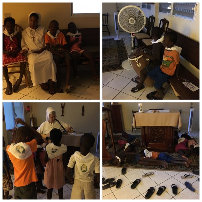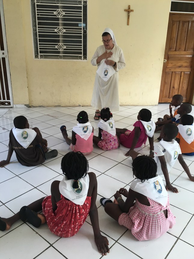 On Wednesday, July 13, our little ones got the opportunity to participate in their own Year of Mercy Pilgrimage. During this Year of Mercy, we have been teaching them the gift of Divine Mercy in various ways. They were given the pilgrimage scarf; and Sister Inga spoke about the meaning of the logo of the Year of Mercy, as well as the importance of pilgrimage and walking with Jesus everyday and sharing his mercy with others. Then we walked through the streets in procession, visited an elderly lady who needed prayers for healing, and ended in our chapel by praying together the Divine Mercy chaplet. One of our little girl’s, Deli, said after praying the chaplet: “Mwen santi mizerikod Bondye.” Translated says: “I feel God’s mercy.” Her face was so delighted by the experience.