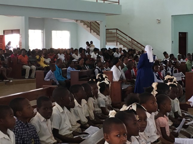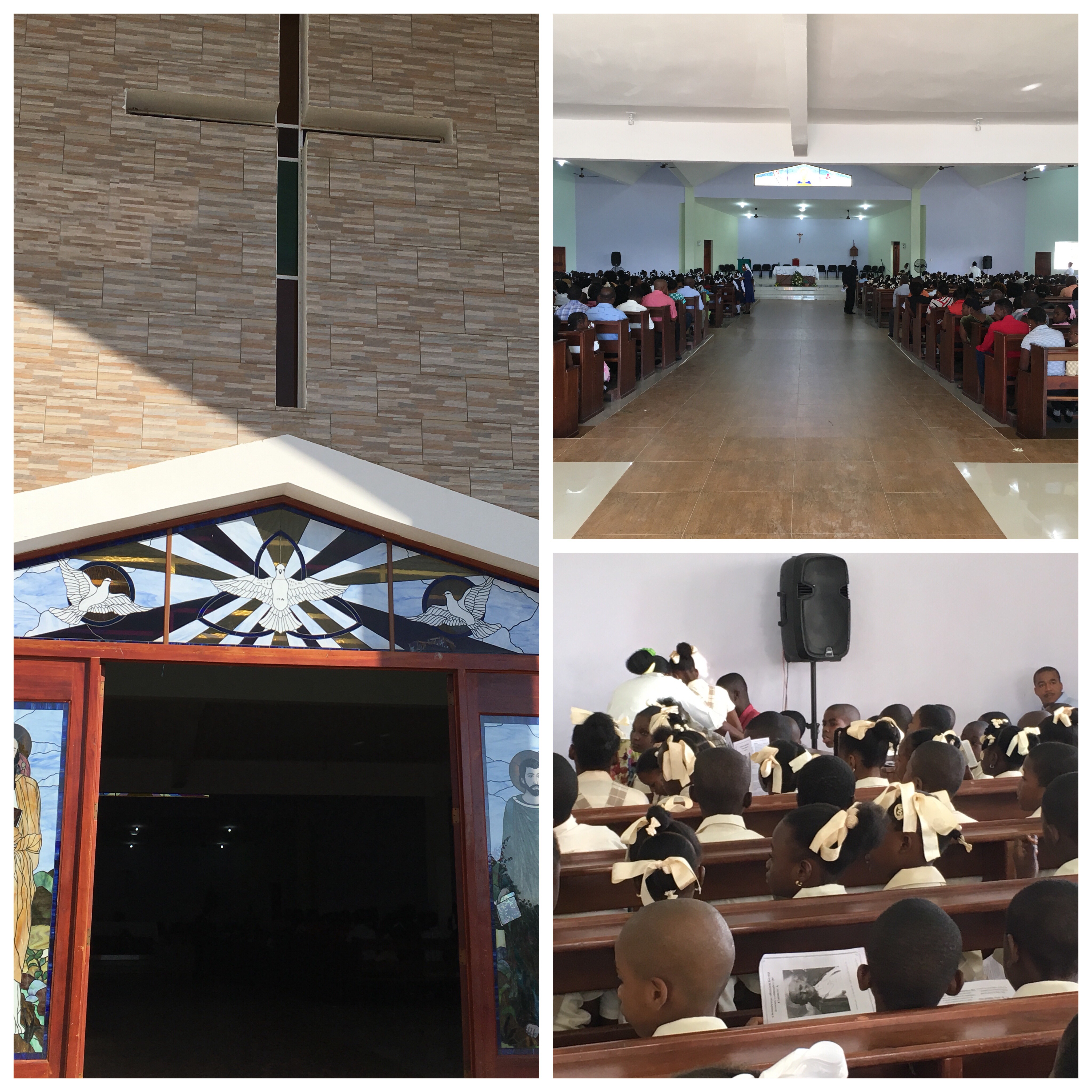 Every first Sunday of the month, we go to a special Mass for children preparing for their First Communion in Jacmel. They are kids from the Catholic Schools and those who are in catechetical programs. We bring five of our kids every month to this Mass in the new multi-purpose center. This was built after the earthquake because our Cathedral was destroyed.