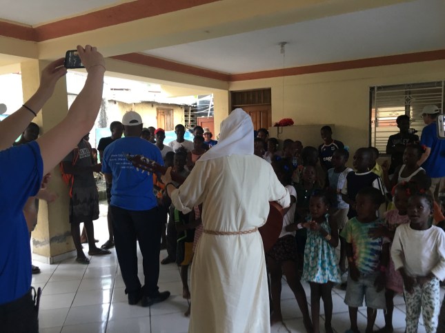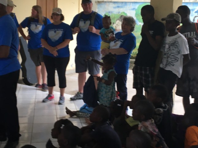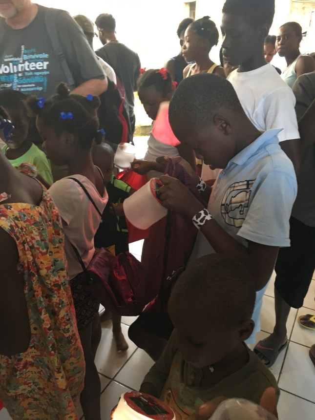 The group came to meet our kids while we had our food program. They began with the song “This Little Light of Mine,” sung in English and Creole and, of course, our kids knew it! Then they distributed back sacks. The kids and teens also received a brand new soccer ball. Everyone had a blast.