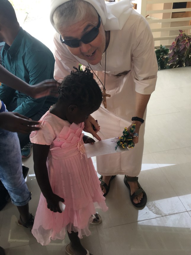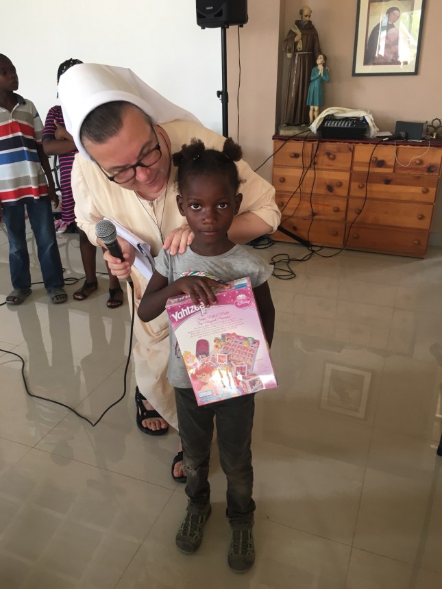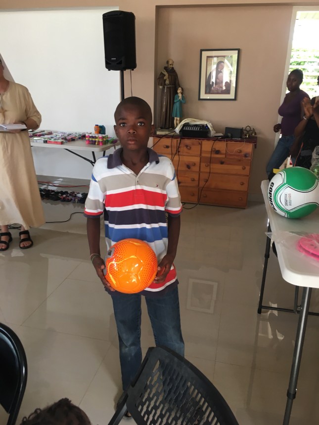 After everyone enjoyed their food and cake and soda, it was time for everyone to receive a gift. When all had walked in, they received a number. When their number was called, they were able to choose a gift. Of course, the soccer balls went first. Everyone received a pair of sandals, and the girls received a famous “pillow dress.”