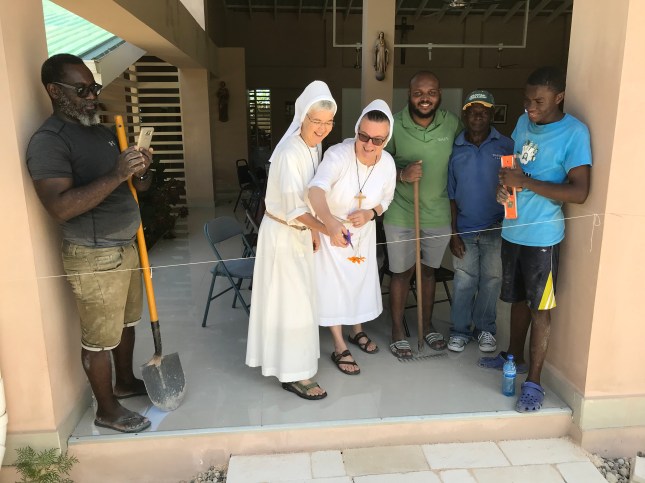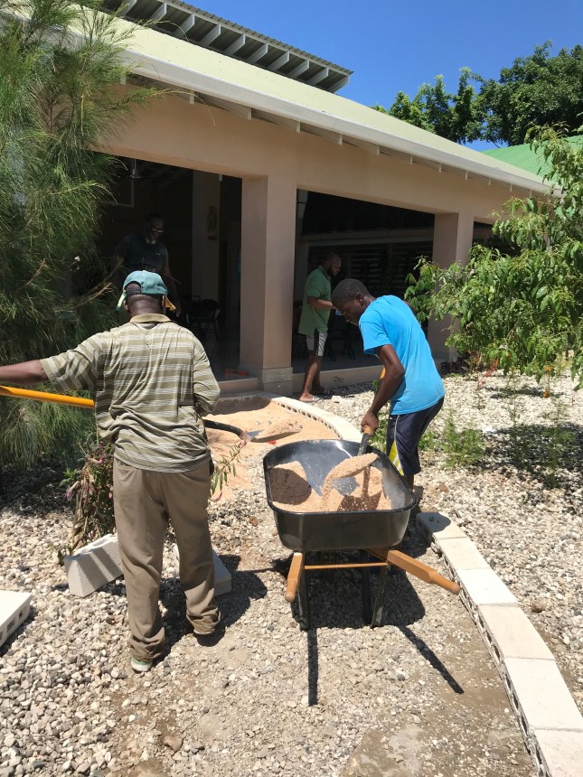 During the week of May 27, we wanted to do some re-modeling of our grounds. Since we have some guests with us from the Neocatechemenal Way, they volunteered to help us make two pathways–one to Our Mary shrine and the other to the activity center. Fr. Alan (originally from the Ivory Coast) and Eddy (from the Dominican Republic) are both Catechists from the Way; Jean Philip, the young man who lives on our grounds and works with us, and John, our gardener, all worked hard to make our mission a place of prayerful welcome.