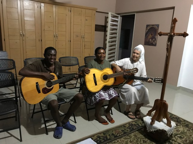 Teaching Jean Phillip and Annette how to play guitar so they can be cantors too.