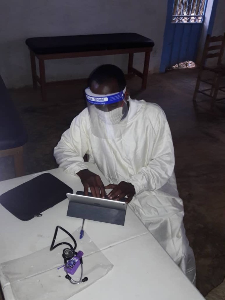 From left to right, Dr. Yves, Dr. Valcin and TCheri a medical student.Nèlie our nurse (r) and Rosemanie our pharmacist (l).Fritz our driver.Nèlie taking vital signs and preparing the patient to see the doctor.Dr. Valcin putting patient information into the iPad.Dr. Yves waiting for his next patient.Mother Angela Clinic team from left to right: Dr. Yves, TCheri, Rosemani, Dr. Valcin, Nèlie, and Fritz.