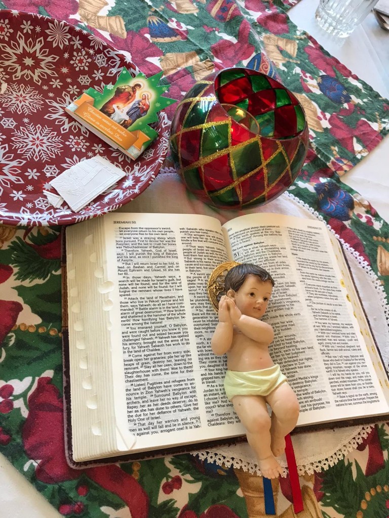 Eric reads the story of the birth of Jesus!Sr. Inga tells the story of the Christmas wafer and the meaning of the empty chair and the extra place setting for whoever comes to the door. It is for Jesus.As soon as we sat down, the doorbell rang. It was Stefanie, one of our teens, so she joined us for Christmas Wigilia. She was our Jesus visitor.