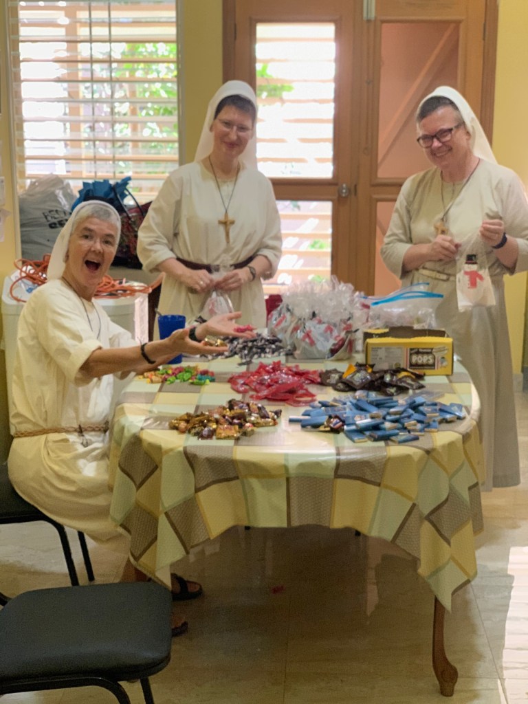 Some of you may know that, when we are in New Jersey, we are always busy anticipating another holiday feast. With that always in mind, we need to purchase things and send them in barrels to Haiti. Here we are preparing treat bags, filling them with chocolates and sweets for our kids for our Christmas Day celebration!