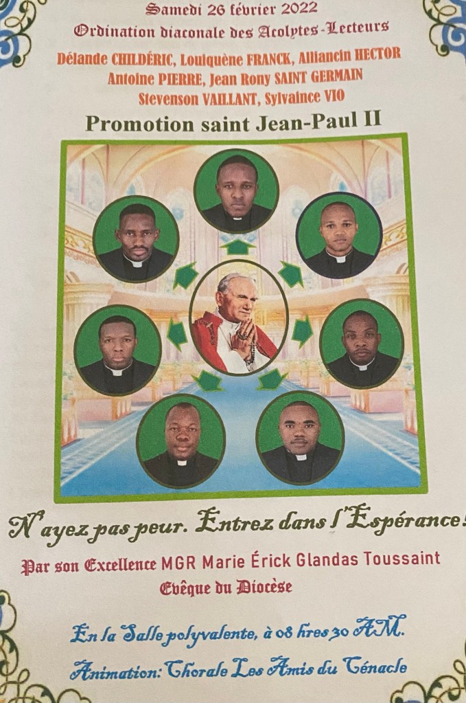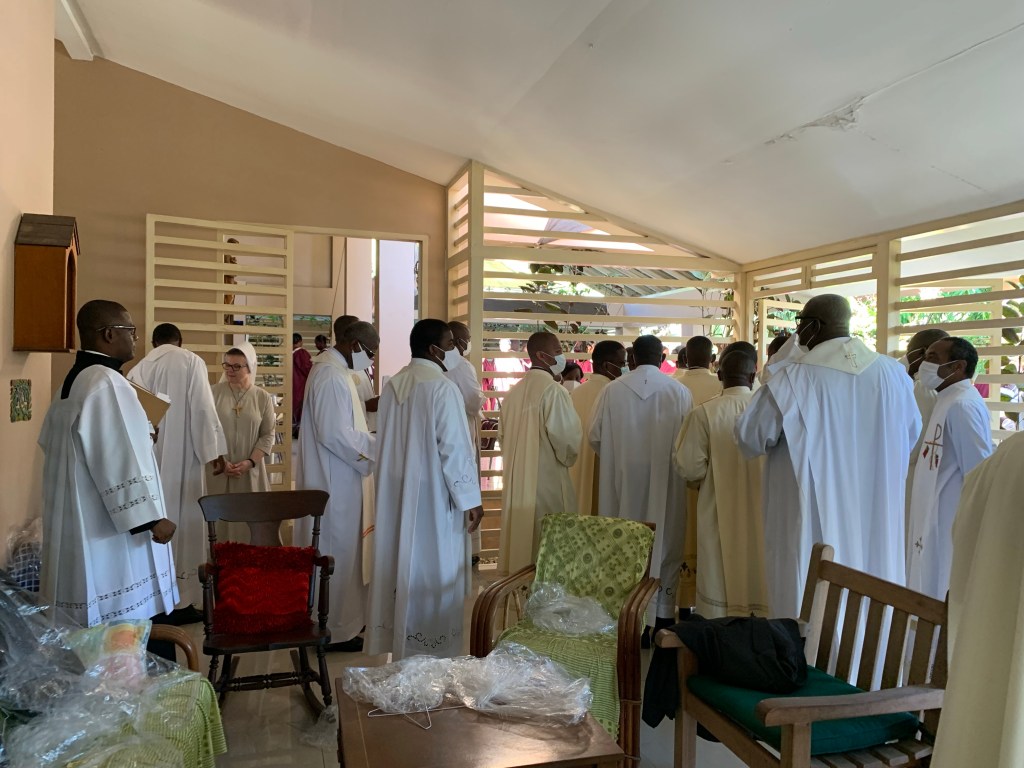 On Saturday, February 26, seven young men from the Diocese of Jacmel were ordained transitional Deacons. The priests and choir gathered here in the Felician Mission for the procession. After Mass, many gathered here for the reception.